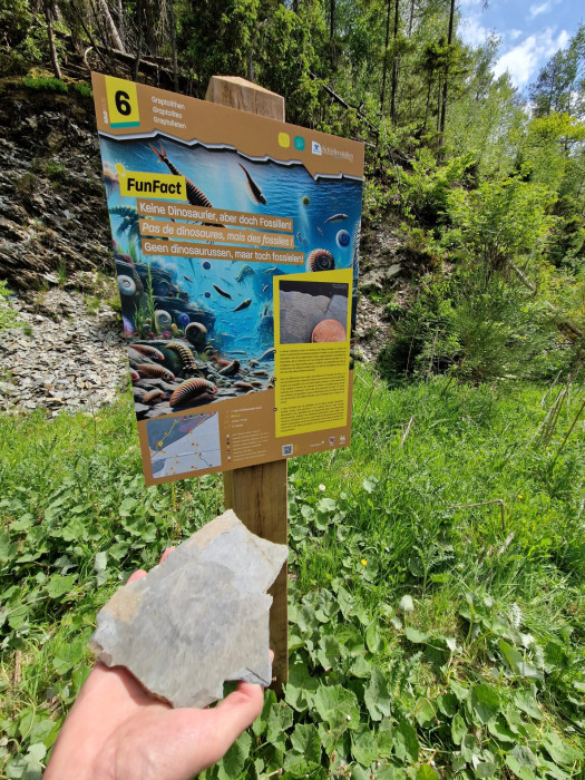 Gemeinsam mit Prof. Dr. Thomas Servais und Herrn Jean-Marc Marion entstand dann 2023 ein konkretes Konzept für drei thematische Wanderrouten zur Geologie in und um das Dorf Recht. Während der Schieferstollen und sein Museum besonders die montanhistorischen Aspekte, also die Geschichte des Stollens, die Verwendung des Blausteins, usw. hervorheben, sollten hier Fragen beantwortet werden, wie etwa: Wie alt ist das Gestein? Was ist Coticule? Wo liegt der Unterschied zwischen dem Gestein aus Recht und jenem der Nachbarorte? Wo kommt Gold her und wieso findet man es in einem Bach, aber im Nächsten nicht?